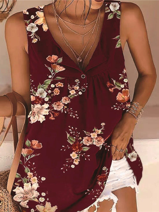 Printed V-Neck Buttons Sleeveless Tank Top Women's T-Shirt
