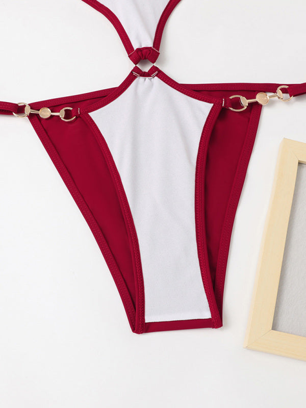 New one-piece multicolor hollow sexy pearl chain halter neck swimsuit