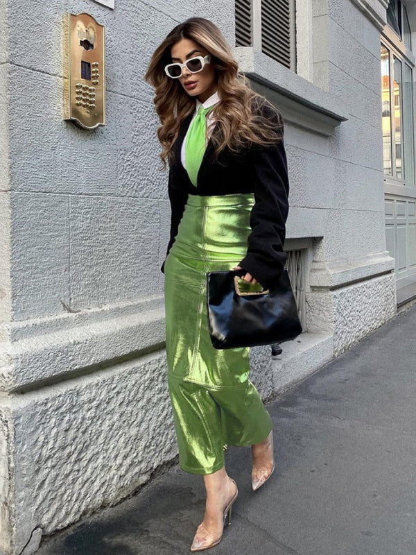 Women's Slim Fit Hip Covering Spliced Slit PU Leather Skirt