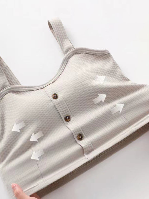 This ribbed knit tank has button-front details and an abbreviated hemline for modern flair.