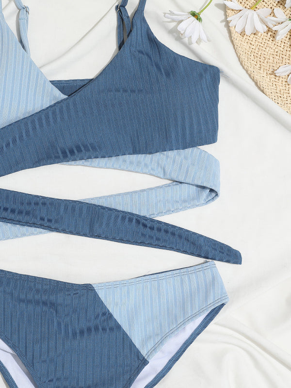 Women's solid color color block thick pit strip cross strap high waist bikini