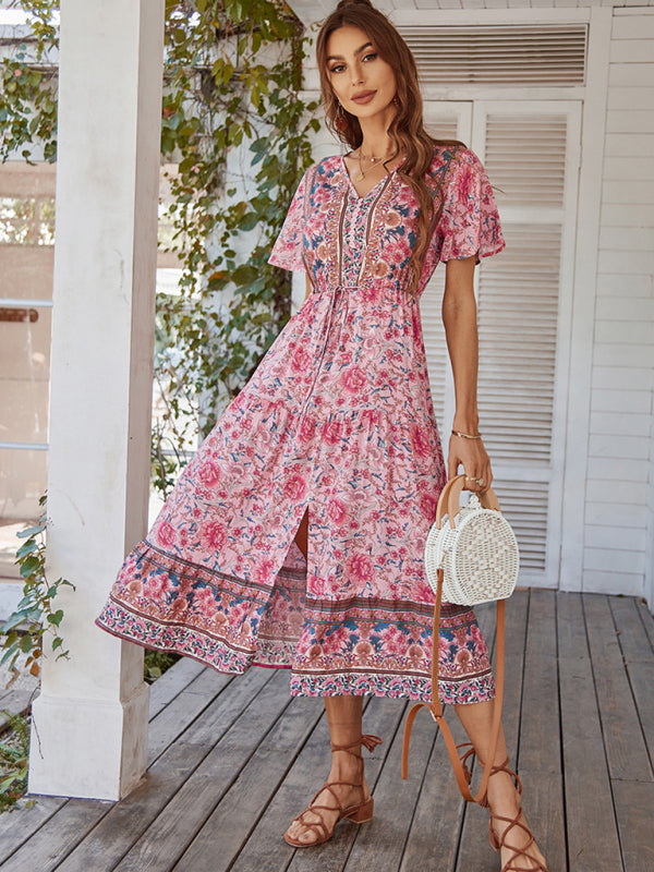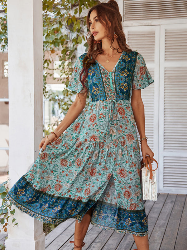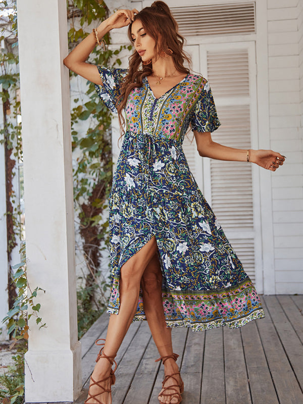 Women's V-neck short-sleeved bohemian long-sleeved dress